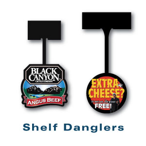 Digitally die-cut shelf-danglers saves money without die cost. We do this full color printing on the latest digital press or screen print press. Shelf danglers are an ideal way of promoting products at point of sale and at the point of purchase. As an integral part of shop and store advertising shelf danglers are simple to use and create an effective display system and shelf edge advertising.